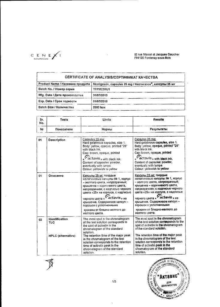 1 капсула Неотигазон 25 мг содержит активное вещество: ацитретин 25 мг, (в виде сухого спрея, содержащего 25 % активного вещества).