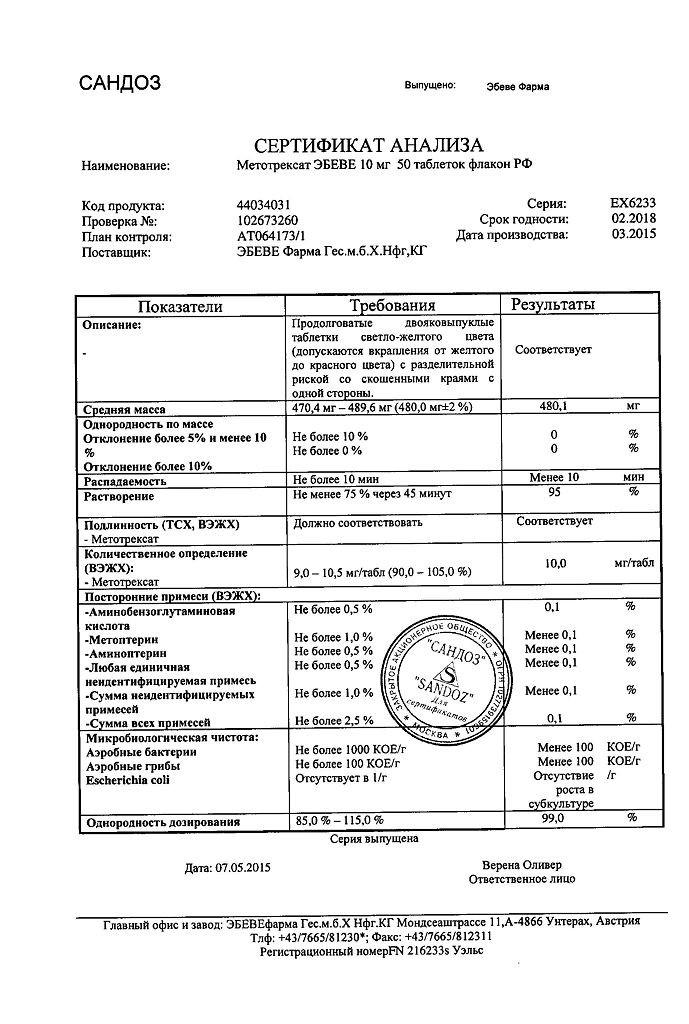 Показания. Рекомендовано купить Метотрексат Эбеве 10 мг в таблетках для монотерапии острых лейкозов лимфоцитарного происхождения и неходжкинских лимфом. Также препарат Methotrexate может применяться в лечении ревматоидного артрита у взрослых, и в терапии распространенного хронического псориаза, особенно у лиц пожилого возраста и инвалидов (в случае неэффективности стандартной терапии).